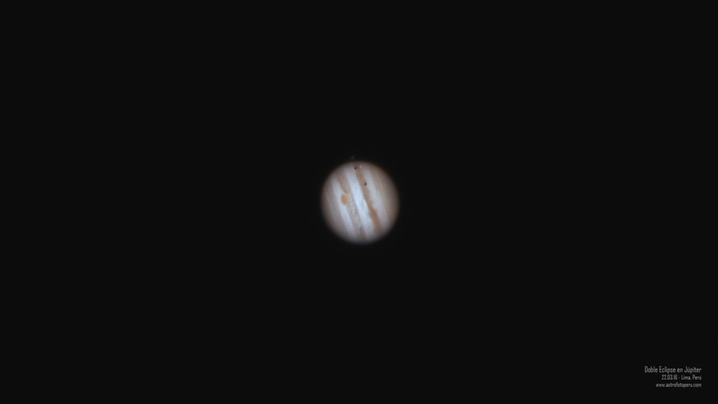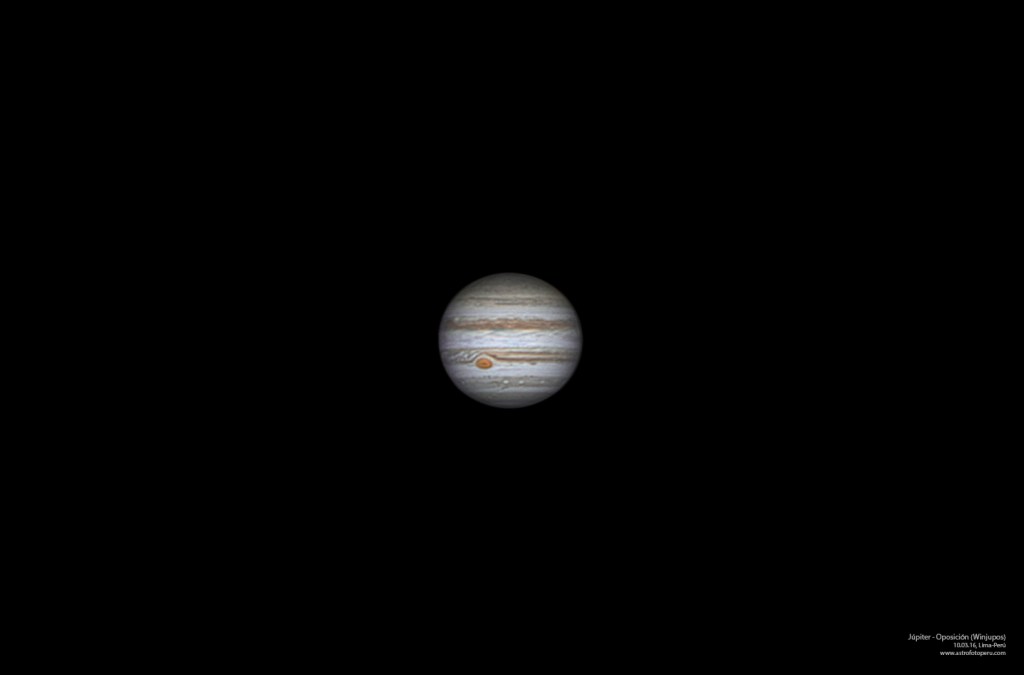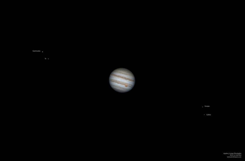 Estas son algunas de mis mejores fotos de Júpiter. Fueron tomadas desde el techo de mi casa en Lima. En ellas se aprecian detalles atmosféricos del planeta, como la gran mancha roja, bandas de colores separadas por corrientes de vientos, tránsitos/eclipses lunares, y sus mayores lunas orbitándolo. En todos los casos se usó la técnica de apilación de imágenes.