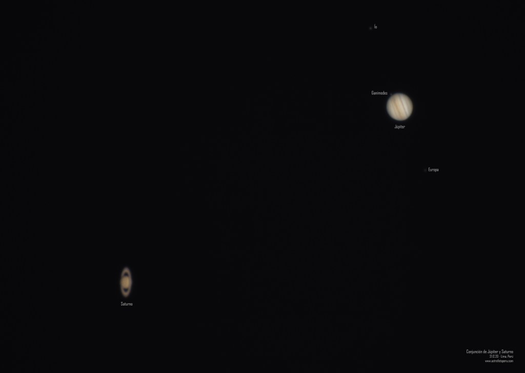 Dos de sus lunas mas grandes, Io (abajo) y Ganímedes (arriba) se ven como puntos luminosos, que en realidad tienen 3643 km y 5262 km de diámetro respectivamente.